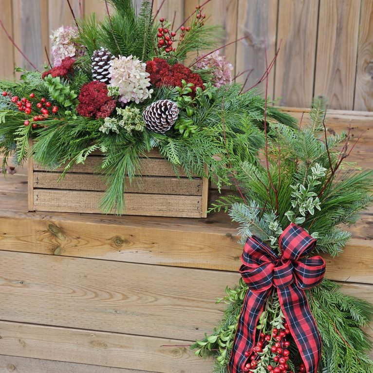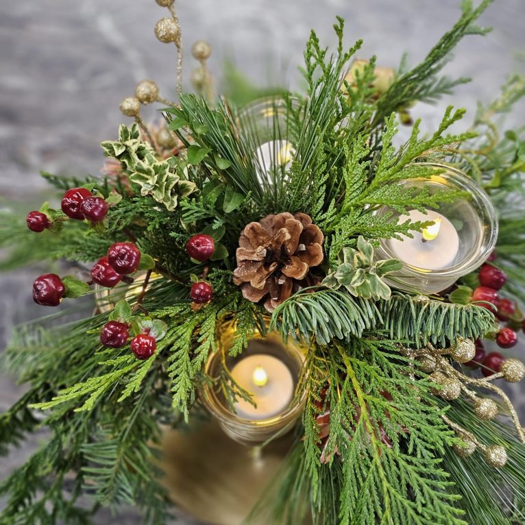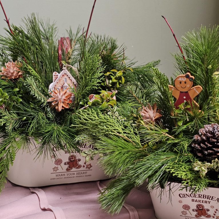 A basic tree shape will materialize as participants add green and variegated boxwood to the fresh floral foam base secured in the glass pot. Once “greened up”, pinecones and small accents will decorate the tree, to personalize it. We will include choices to make your tree natural or sparkly – or a combo of both styles! The overall height for this arrangement will be approximately 18” and it is a great option for someone who doesn’t wish a large tree in house and needs just a small tabletop tree for the season.