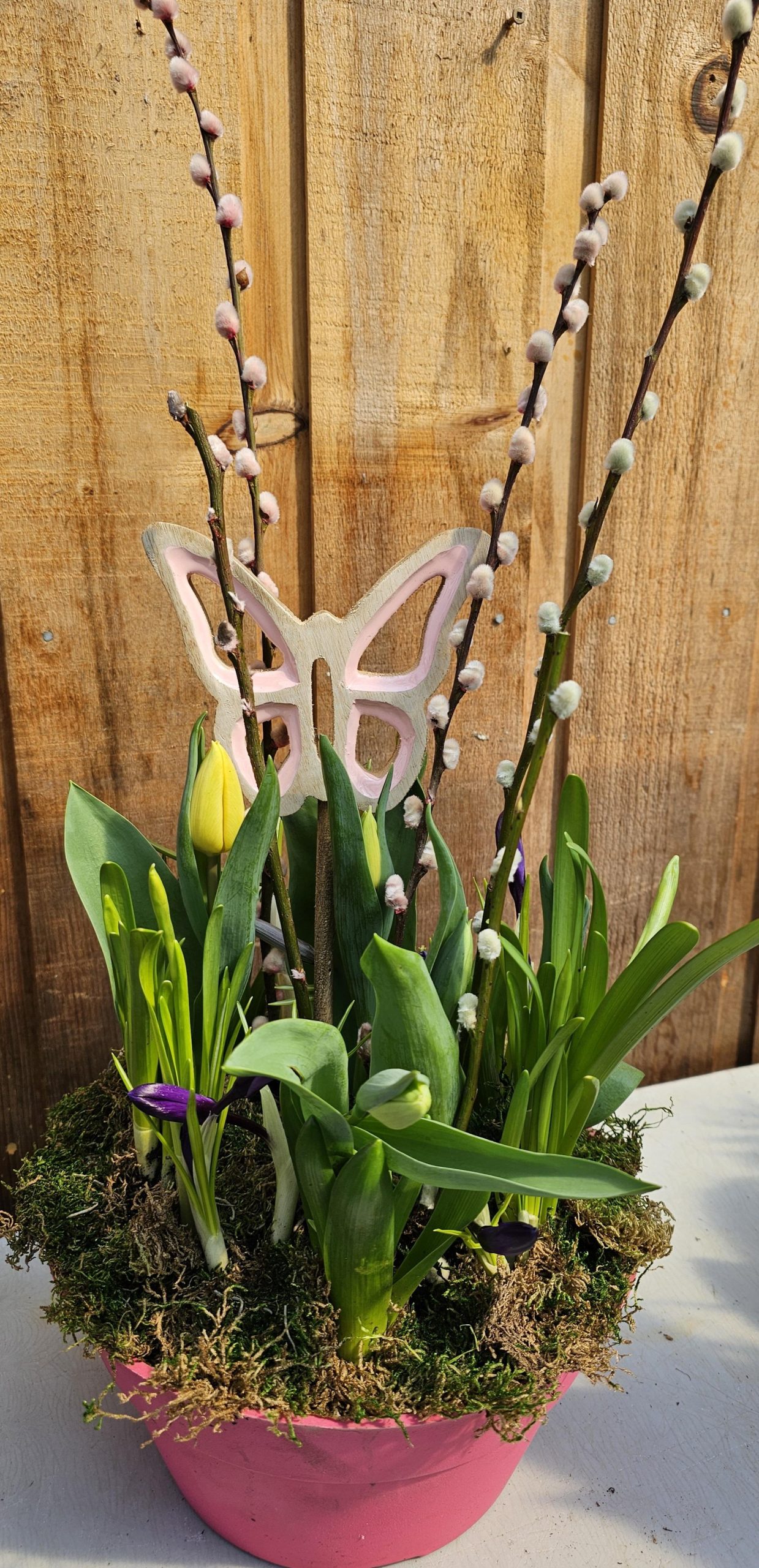 Prior to your pick up, our staff will stylise it with decorative moss, fuzzy pussy willows and a high-quality glazed ceramic bird or butterfly décor stake. This is an upgraded twist on a Spring favourite, and only these 50 units will be available, dressed in this fancy way!